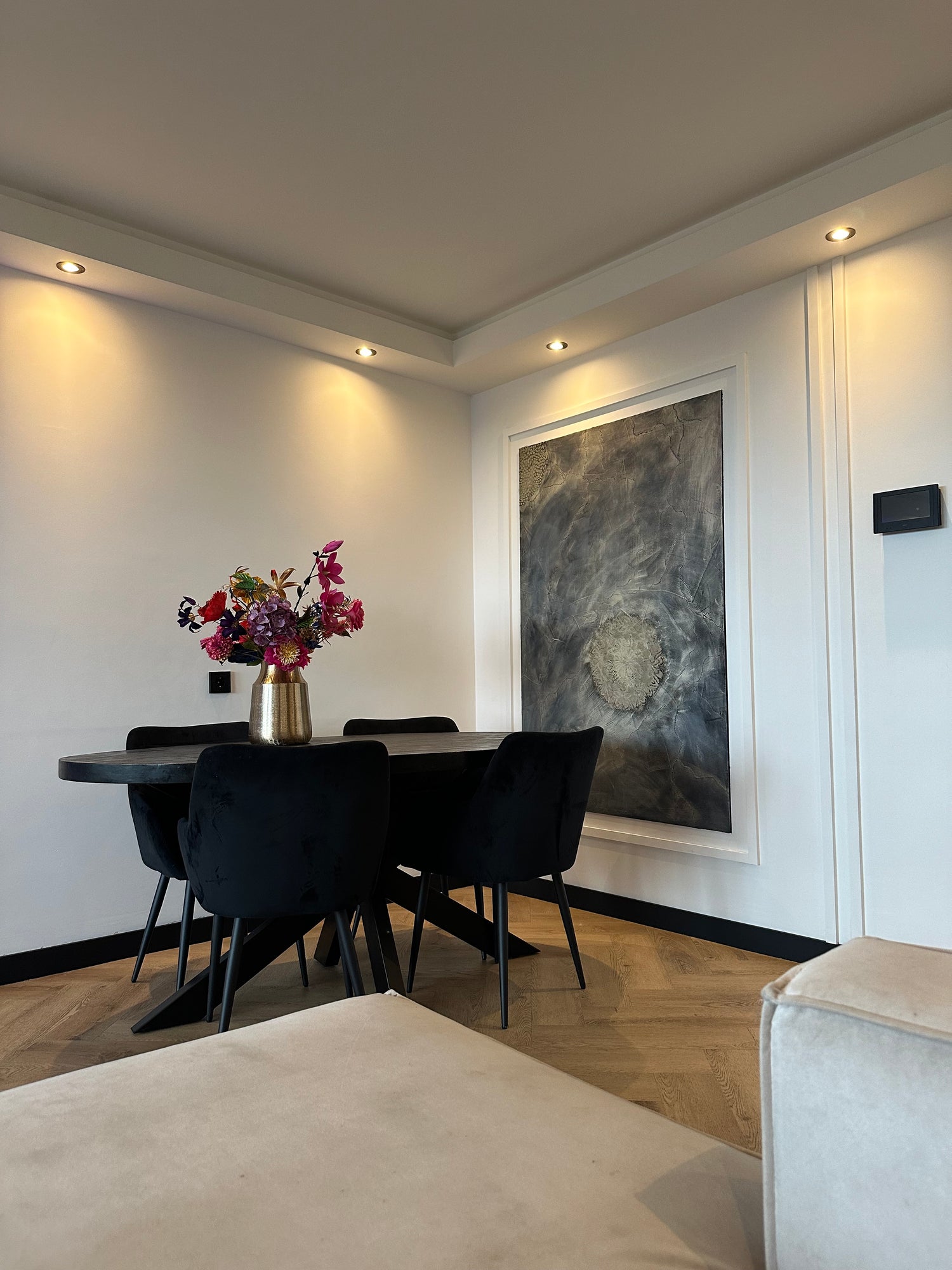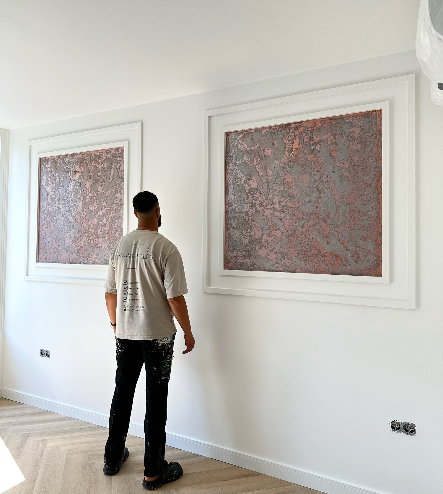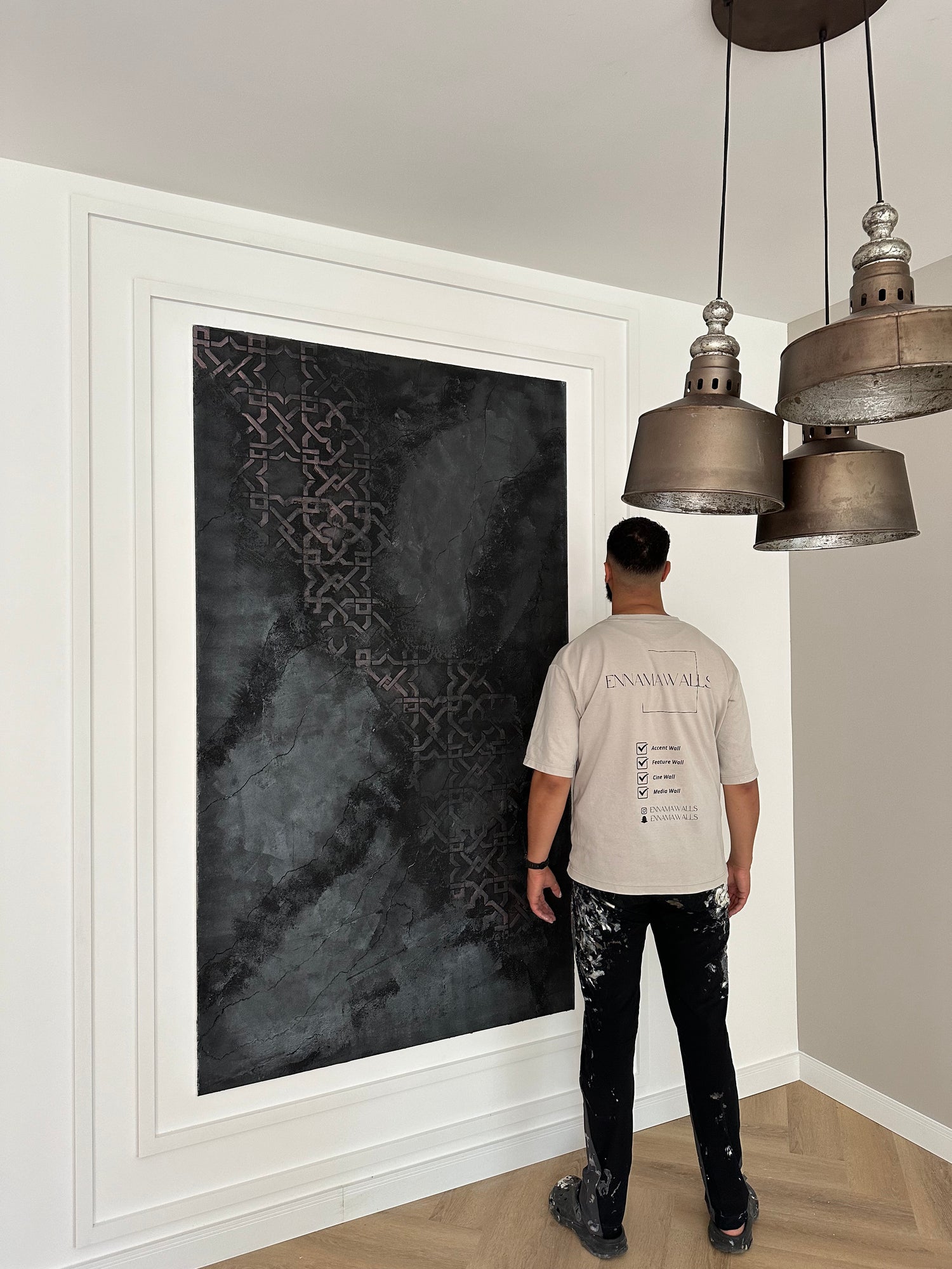 Deze extreem luxe accentwall is een meesterwerk dat handgemaakt decoratief stucwerk combineert met verfijnde Venetiaanse kunsttechnieken. Het stucwerk, met zijn rijke texturen en subtiele glans, creëert een unieke diepte en dimensie. Deze muur fungeert niet alleen als een visueel statement, maar voegt ook een gevoel van luxe en verfijning toe aan elke ruimte. Het gebruik van traditionele technieken en moderne esthetiek maakt deze accentwall tot een tijdloos en elegant element in elk interieur.