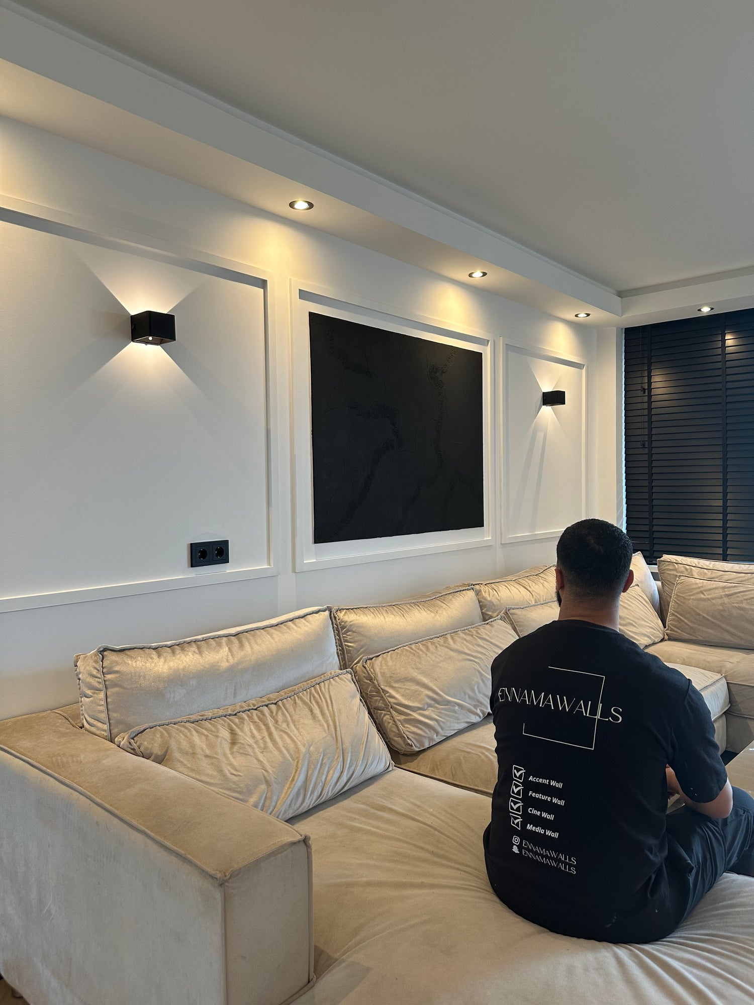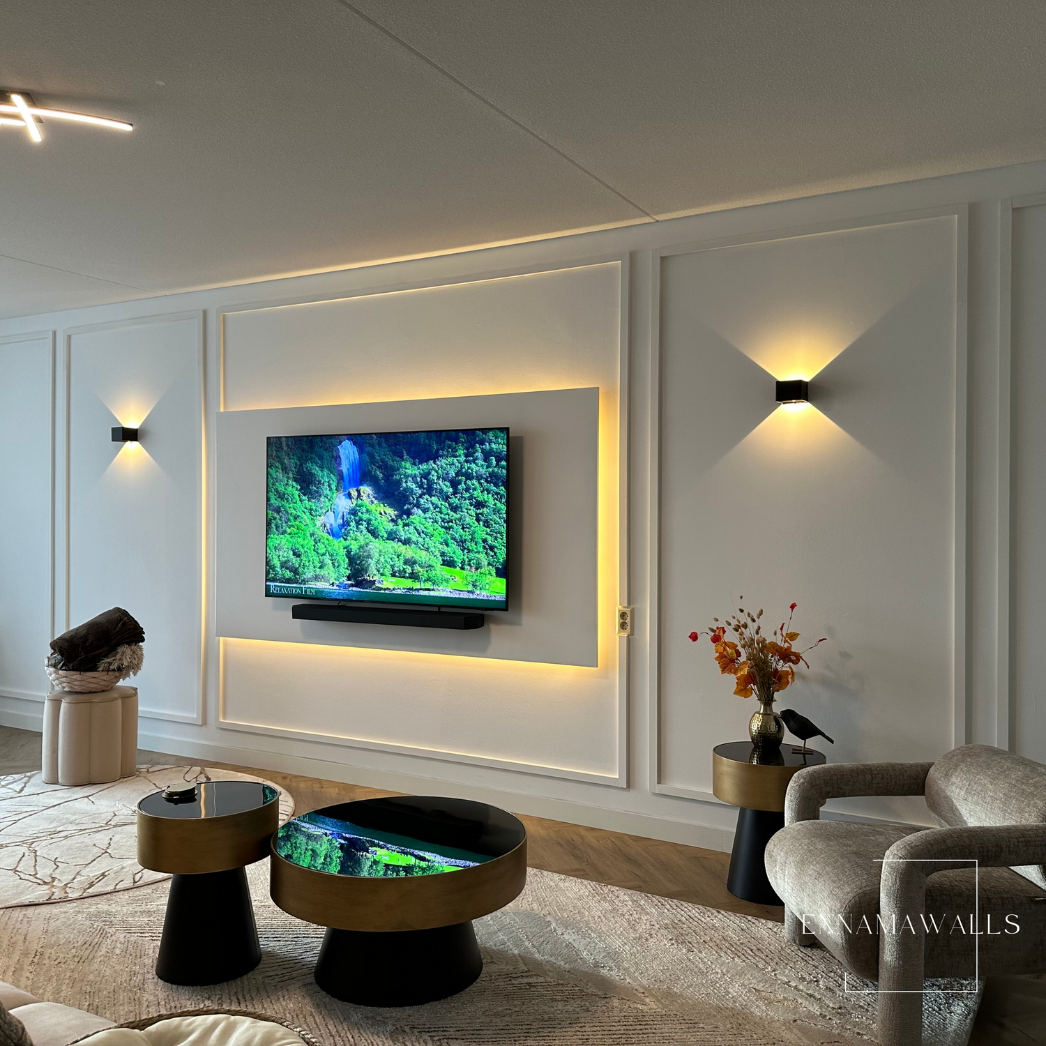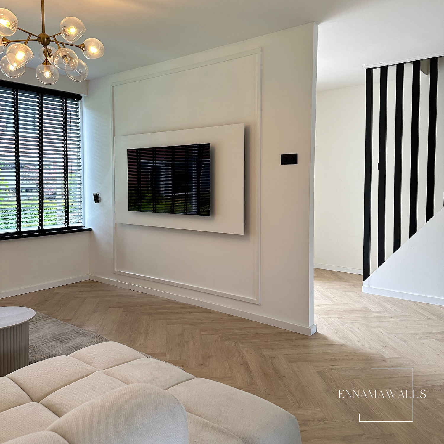 Deze elegante accentwall boven de bank is een ware blikvanger, met drie zorgvuldig vormgegeven vakken. Het middelste vak herbergt een luxe decoratief kunstwerk dat de aandacht trekt en de ruimte verrijkt. De combinatie van de vakken en het kunstwerk creëert een harmonieuze balans, waardoor de muur niet alleen een stijlvol statement maakt, maar ook een gevoel van verfijning en karakter aan het interieur toevoegt.